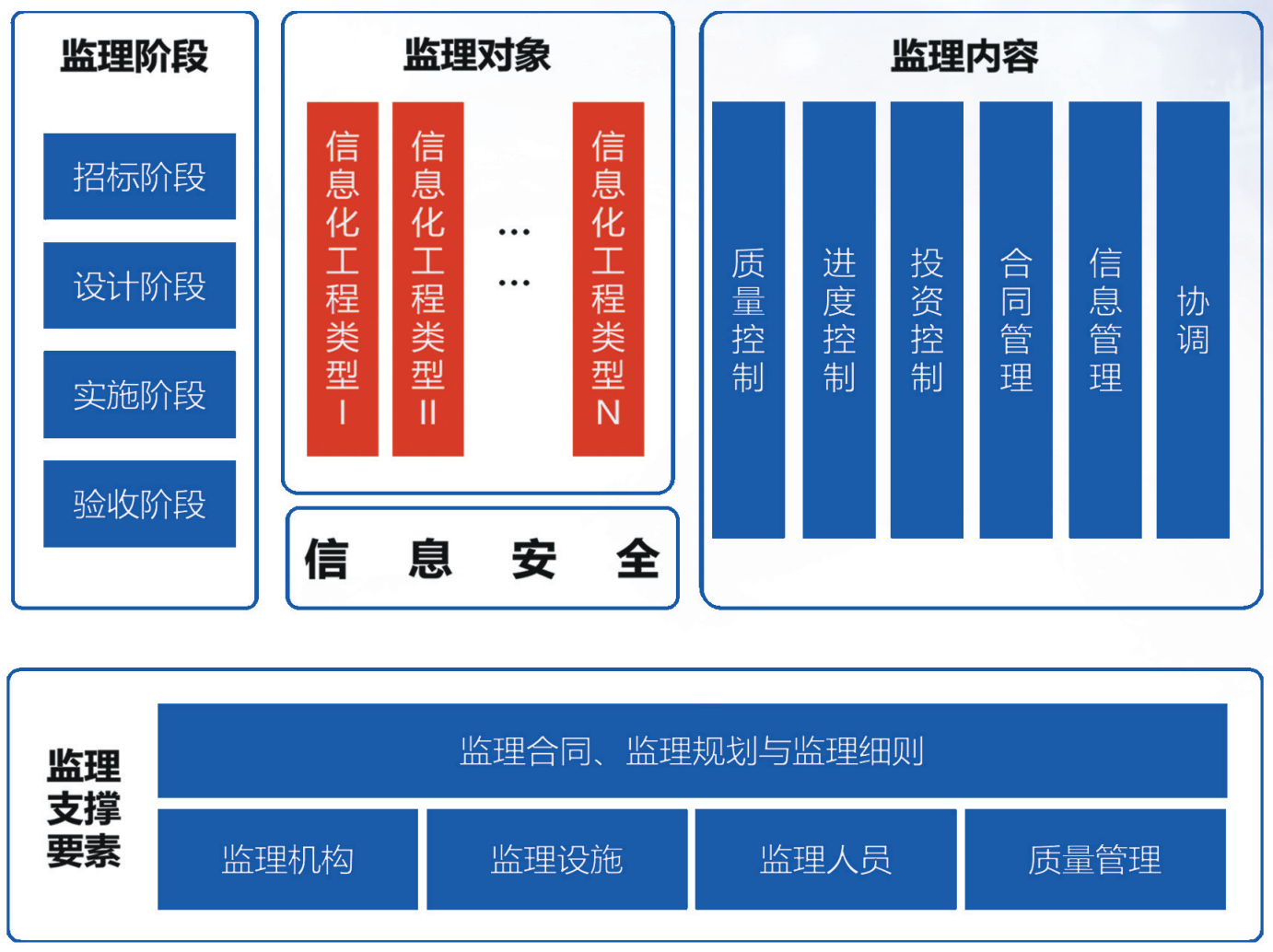 依照《信息系统工程监理服务标准体系》的相关要求,通过"四控制"、"三管理"、"一协调"的手段,采取科学的组织措施、技术措施、经济措施,协助业主对项目建设的全过程进行检查监督和协调管理;同时从项目事后审计的视角,对项目全生命周期里的各种申报、审核、备档流程组织多方论证,对所需材料按照国家档案管理的相关标准统一汇编,并移交业主单位;确保项目建设行为合法、合规、科学、经济,达到建设合同约定的目标。